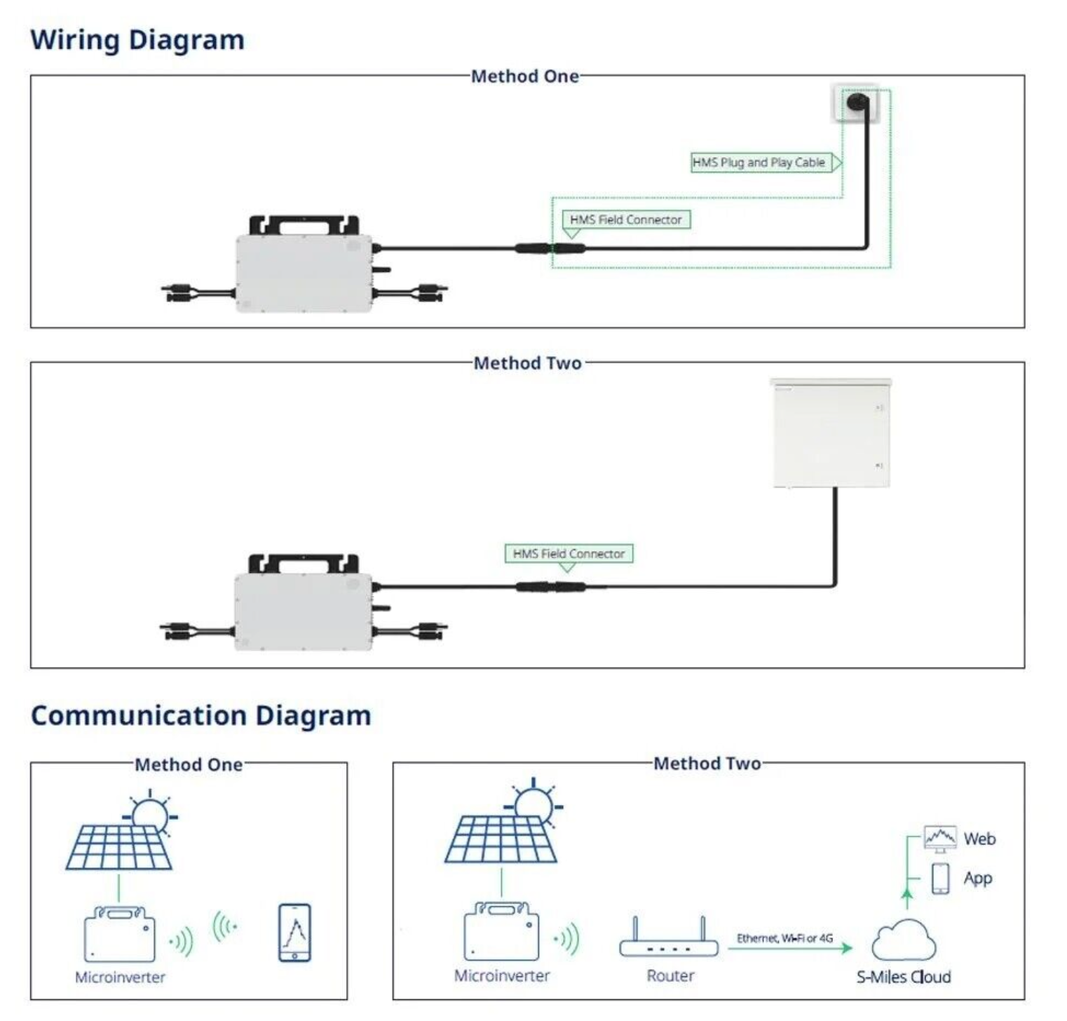 Falownik został specjalnie zaprojektowany do użytku w systemach mini-PV i jest wyposażony w wysokiej jakości moduł WiFi. Przyjazny dla użytkownika kabel HMS Plug & Play sprawia, że instalacja jest bezproblemowa. Mikroinwerter można podłączyć bezpośrednio do gniazdka elektrycznego bez konieczności skomplikowanego okablowania. Ponadto HMS-800-2T upraszcza monitorowanie systemu, zapewniając dostęp w czasie rzeczywistym do danych produkcyjnych poprzez bezpośrednie połączenie ze smartfonem. Ponadto S-Miles Cloud umożliwia zdalne monitorowanie.
